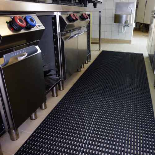 These mats have drainage holes that allow liquids and waste to pass through. Their comfortable construction eases fatigue and increases productivity. Available with a gritted surface for extra traction, they come in a greaseproof red or grease resistant black color.
