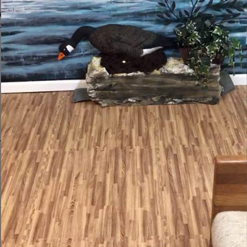 His basement was previously used for storage and the installation of the wood grain foam tiles, they were able to convert it into a recreational and entertainment space that includes a putting green as well as craft and sewing areas.