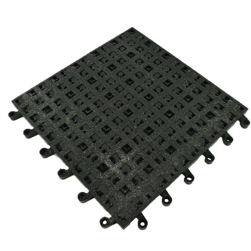 The interlocking system ensures that adjacent tiles will be tightly connected with no gaps between the tiles. This is an important part of the design of our grit flooring, as it allows the square-shaped perforations to collect any liquid spills and move them efficiently through to the subfloor.
