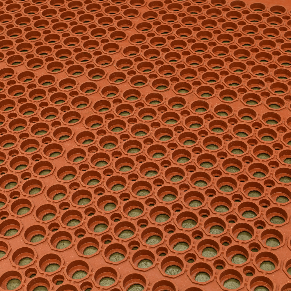 VIP Topdek Senior Red Mat 36x118.5 Inches is a heavy-weight red mat that is grease resistant for light grease applications. This mat has a molded bevel edge for added safety. The surface is anti-slip and anti-fatigue with hundreds of holes for excellent drainage.