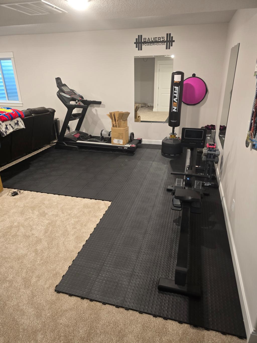 So happy with the result. I covered the carpet with the StayLock mat and the result is fantastic. As you can see in the pictures, I couldn't cover the whole room (because of the measurements) and I was worried for the mat to slip with the weight of the equipment and the movement. But, I have been exercising for almost 2 weeks with no issues so far. The floor is so firm to jump the rope, do jumping jacks and mountain climbers, but you better use a yoga mat for burpees, which won't slip based on my own experience. I fully recommend Greatmats, they have a wonderful customer service to answer all your questions in case you have doubts about what mats works better for you.