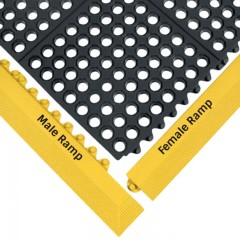 Wet area anti fatigue mat ramp edging 24/Seven edging interlocks with 24/Seven GR Perforated or Solid floor tiles. 24/Seven Edging Female/Male GR Yellow 5/8 Inch x 3x39 Inches which you can’t miss and provides a smooth transition for foot traffic. The GR (Grease Resistant) rubber compound is engineered to resist mineral oil-based fluids.