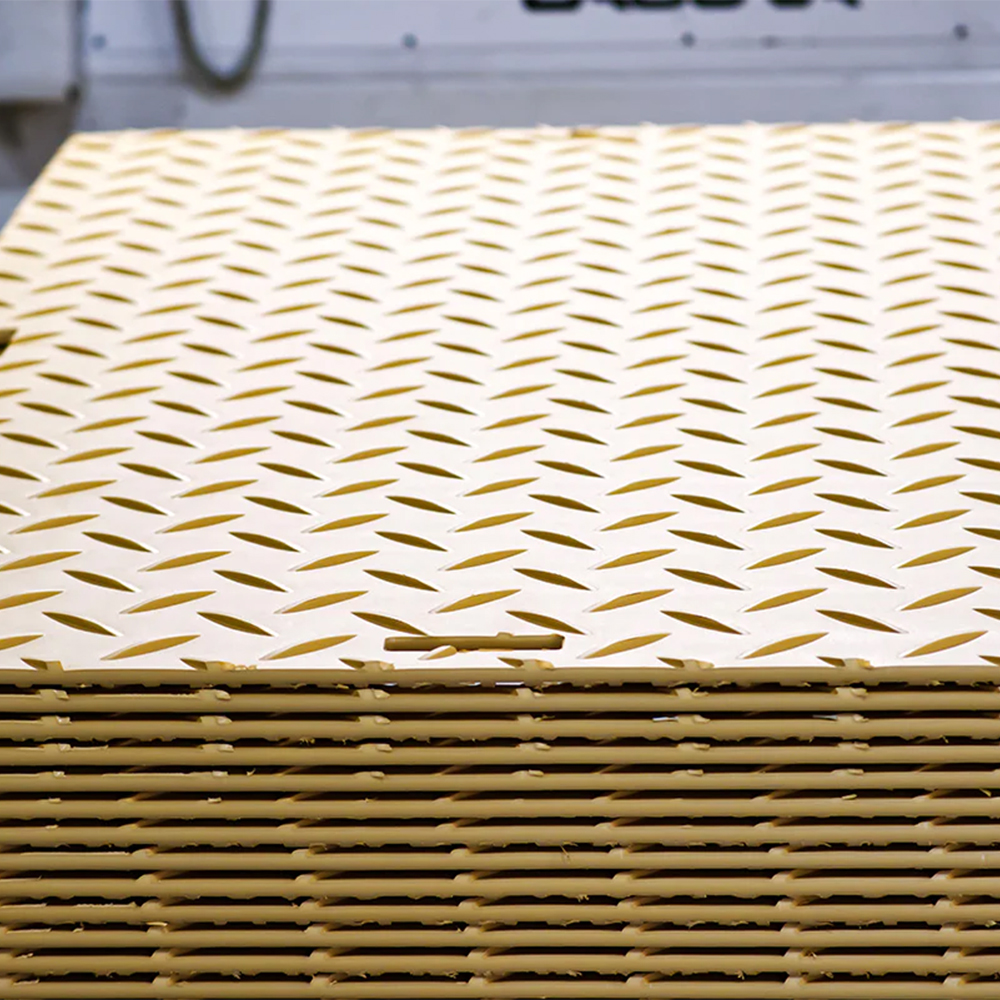 Our mats are made in the USA and are created with superior HDPE (high-density polyethylene), providing traction for landscape protection and equipment. Made to last 15 to 20 years of use. This 4 by 8 foot mat weighs only 61 lbs and is 3/8 inch thick. Does not absorb chemicals or liquids, allowing for easy decontamination when cleaning the mats.