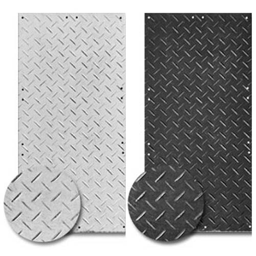 These ground protection mats are available in two reversible texture options: Diamond/Diamond or Diamond/Smooth. The Diamond/Diamond option features a rugged diamond plate texture on both sides to provide traction to equipment. The Diamond/Smooth features the same diamond texture on one side and a smooth but slightly textured surface on the other side. The smooth surface can be placed downwards to leave the turf or grass looking smoother. The smooth side can be placed upwards to provide a smooth walking surface for temporary walkways or wheelbarrow traffic.