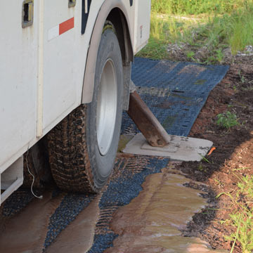 Versa mats and AlturnaMats provide an easy-to-walk-on or drive-on surface. These mats have been tested in record hot and cold temperatures, and come with a lifetime warranty. They are available in black or white, in several sizes, with choices of connectors and tread patterns.Another option is Mud-Traks mats, which are made of composite fiberglass, yet the 45-inch by 8-foot panels are light enough for workers to lift and come with rope handles for easy lifting. They even fit in the back of a pickup truck. These panels are designed for rubber tire/track vehicles under 30 tons. A stronger option can handle 50 tons of weight. They are not suitable for steel-track vehicles. Mud Traks are recommended for utilities, off-road utility access, rental companies, cranes, house movers, well drillers, and special events, and can help move equipment through mud, sand, and swamp.