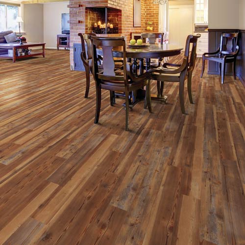 Greatmats’ Cottage Tour Laminate SPC Flooring carries a look in the graphics on the top layer that resembles reclaimed wood in multiple shades of brown, tan, or gray.